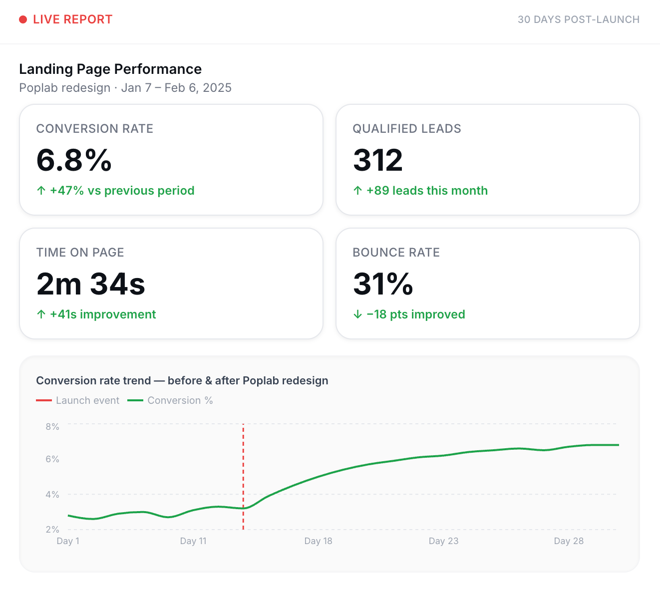“Poplab’s blend of AI analytics and experience design not only improved our site’s look—it increased qualified leads by 32% and conversions by 36%.”