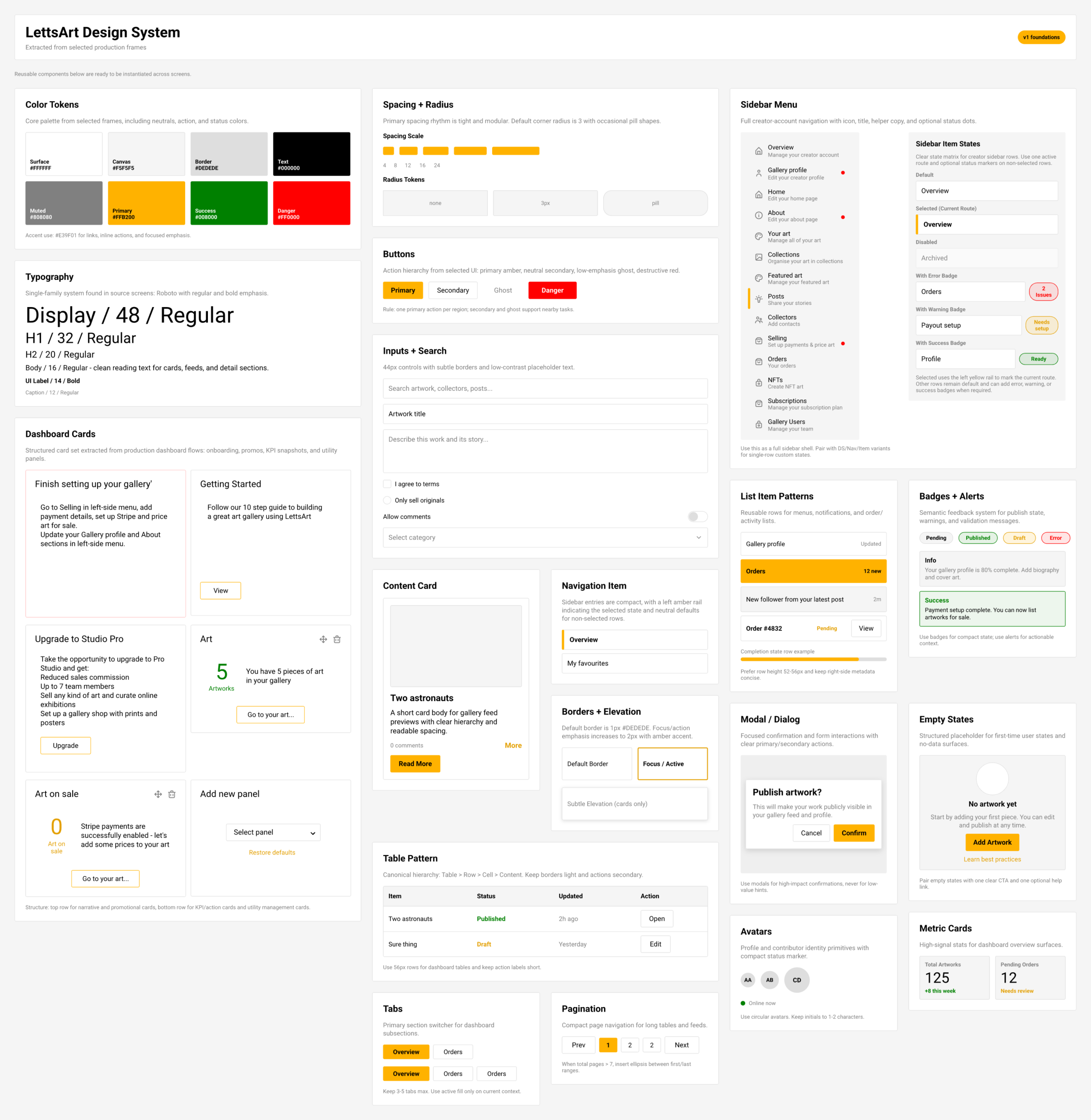 We started by mapping the end‑to‑end creator and collector journeys, then trimmed every unnecessary step between intent and output. The dashboard was organized around decisive actions—create, organize, promote, sell—so the right tasks appear when users are most ready to act. We designed the system before the pages: a reusable component library with responsive rules, accessible states, and AA+ contrast ensures consistency and speed as the product grows.