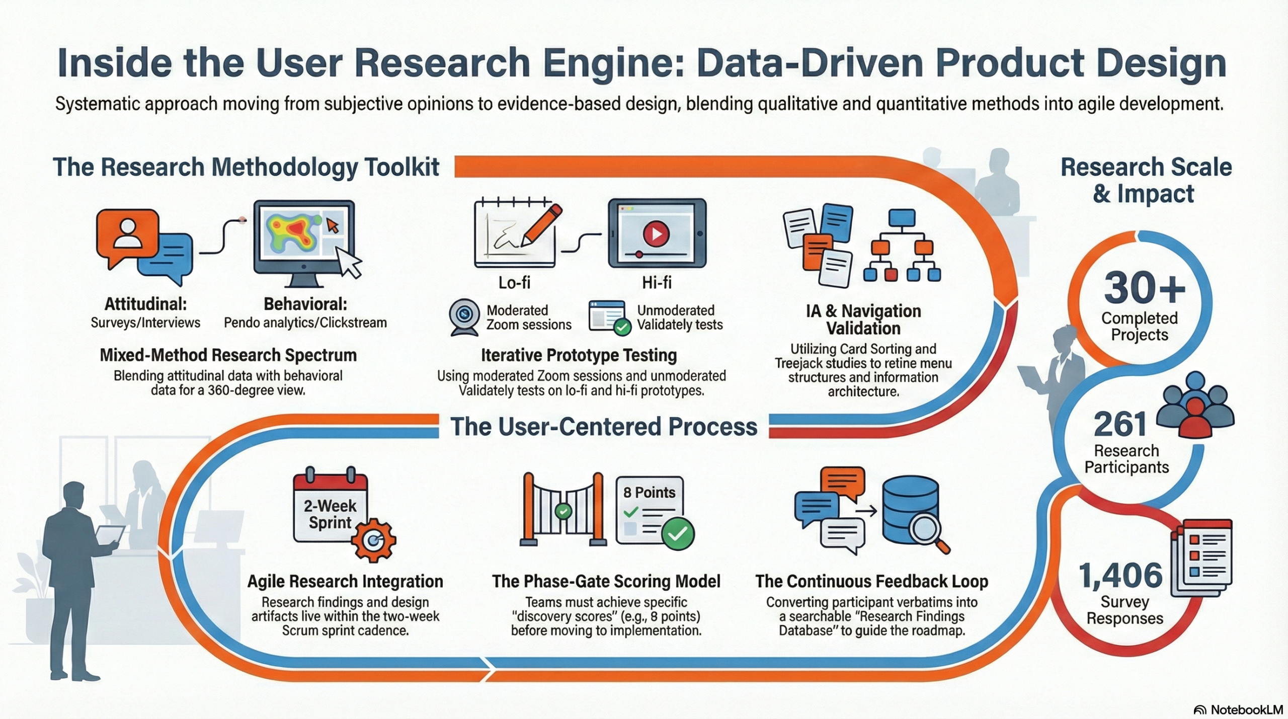 The organisation had no data on how users actually behaved inside the product. Every design opinion was just that — opinion — and engineering and product had years of seniority to override it. My first move was building Mimecast’s first internal user research function: a dedicated team that profiled IT admin personas, mapped behaviours and pain points, and created a continuous feedback loop from real customers. In the first full year, the research team I built ran over 30 projects — hundreds of participants across surveys, interviews, and prototype testing sessions. Every major feature on the roadmap was preceded by a defined problem statement, real customer verbatims, and prototype testing before a single line of code was written. Once we had research data, design decisions became evidence-based conversations rather than preference battles. Product managers who had previously dismissed UX concerns became our advocates when they saw user behaviour mapped against their roadmap assumptions.