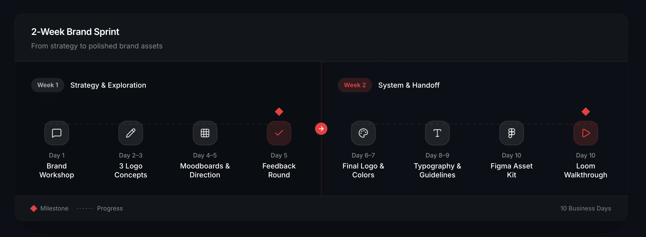 Your product might be strong, but if your brand looks like a side project, investors and customers treat it like one. Rapid Brand Launch gives you a sharp, cohesive identity in two weeks – so your pitch deck, landing page, and product all tell the same serious story.