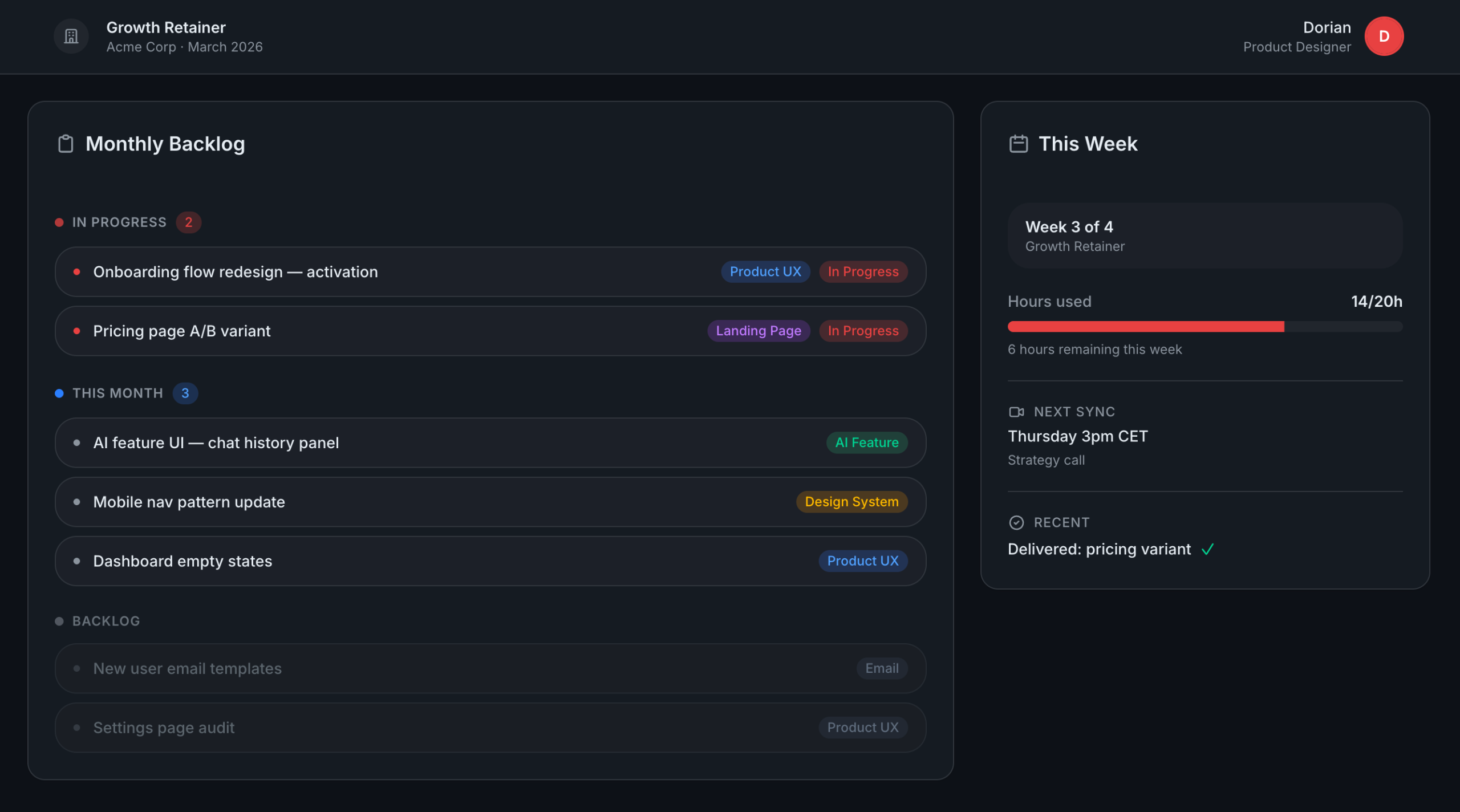 Each month we pick 1–3 key outcomes: improve activation, launch a feature, redesign a landing page, or stabilize your design system. All requests live in a shared backlog; you can add ideas anytime, and work is pulled in based on hours and impact.